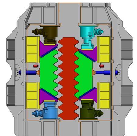 升降系统采用齿轮齿条啮合原理实现平台或桩腿的升降操作。安装在船体的固桩架上,可以采用电机和液压马达驱动,每一升降单元有爬升齿轮、减速机、电机/液压马达和具有自动保护功能的电磁刹车组成。配有电机控制中心、中央控制台和桩边控制柜;锁紧系统由液压驱动,由螺杆升降装置,锁紧齿块,楔块,油缸和分配器,泵站,桩边控制柜等组成。