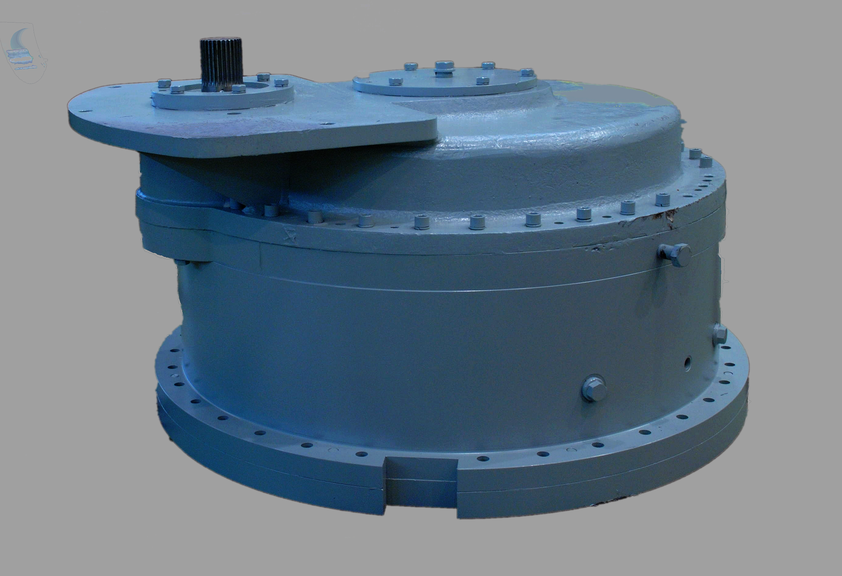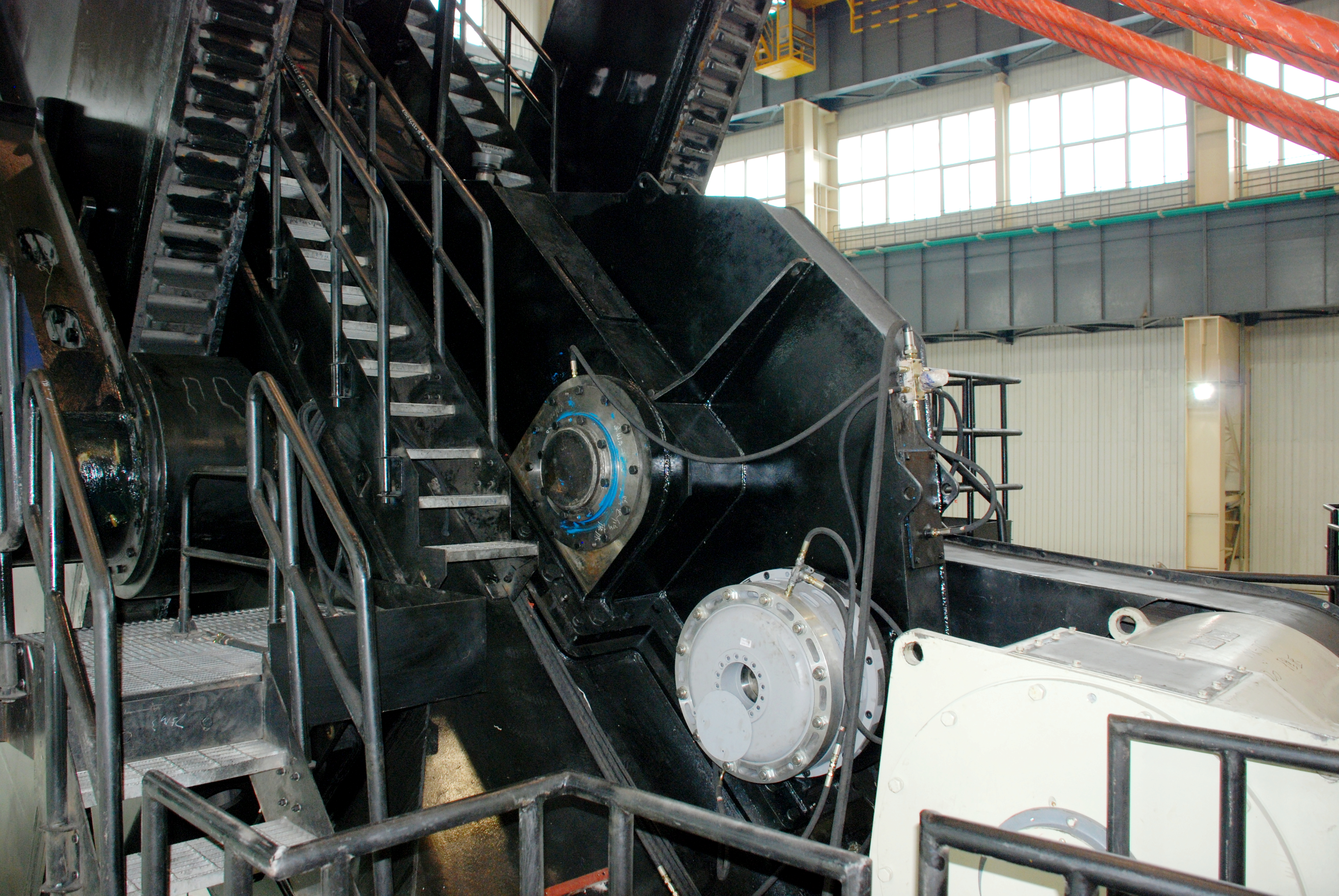 行走减速机、回转减速机为行星传动减速机,具有模块化设计,结构紧凑、承载力大、传动平稳、传动效率高等特点;提升减速机为两级传动平行轴减速机,结构类型为两入一出型式,通过前后的一级减速机后,二级小齿轮同时啮合卷筒齿轮,具有传动速比大,传递能力强的特点;推压减速机为两级传动平行轴减速机,传动速比大,传递能力强。