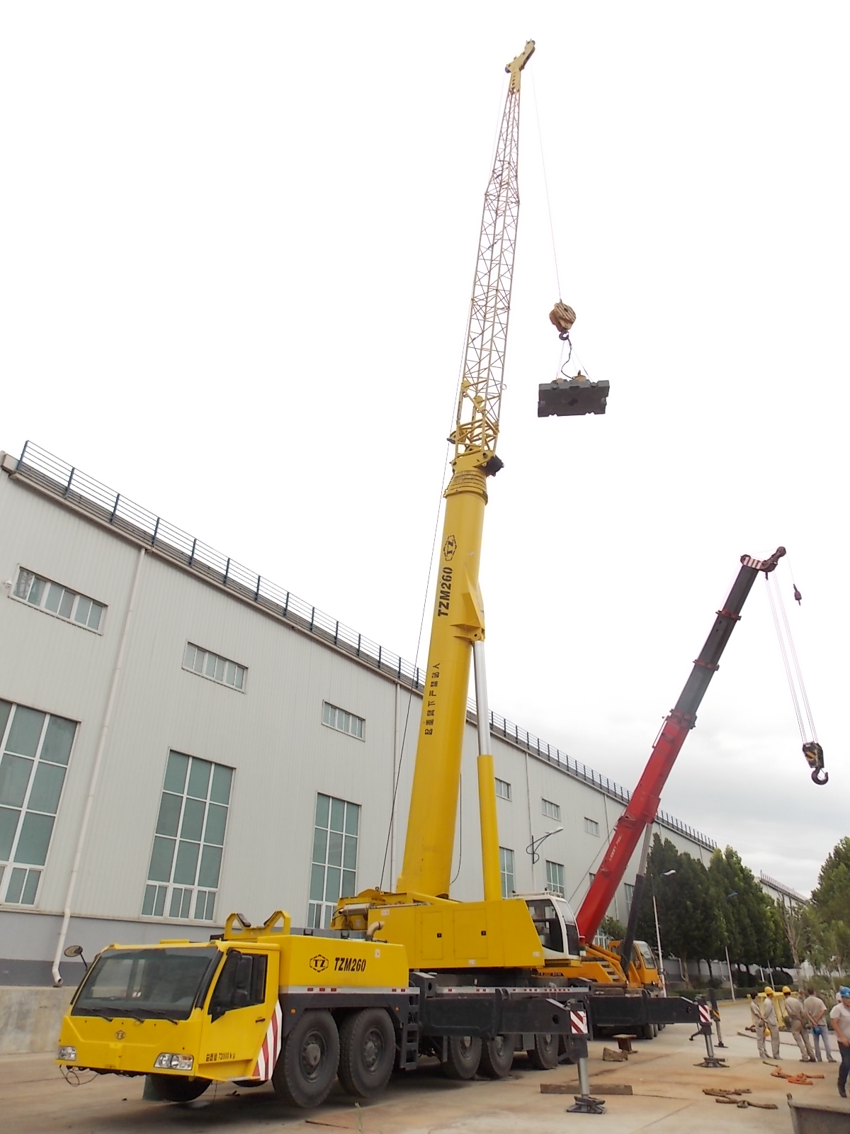 自主研发制造的全地面伸缩臂起重机,全系列产品规格为260t~1600t,主打产品为TZM260、TZM500、TZM1200等机型。已销往天津、内蒙、甘肃、北京、河北、山西等地,受到了客户广泛好评。
