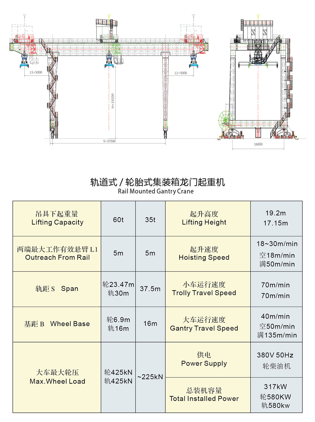 集装箱堆场专用起重机,跨距大可充分利用堆场面积提高堆场堆存能力,可实现自动化。适用于集装箱码头前沿堆场及内陆中转站及铁路集装箱堆场