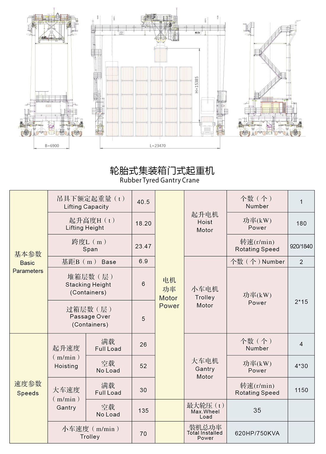 简称轮胎式场桥,是集装箱码头堆场或集装箱货场进行堆码作业的专用装卸机械,主要由起升机构、小车行走机构、大车行走机构组成。包含两个U型门框与底梁组成门式架,支承在充气橡胶轮胎上,可在规定的行车通道上行走。可按滚装发运的方式向客户提供所需的轮胎式集装箱门式起重机。