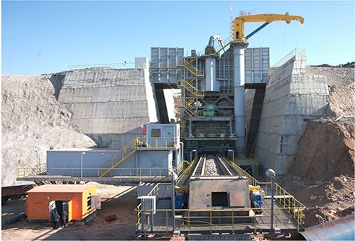 半移动旋回式破碎站为半连续开采工艺(单斗挖掘机—汽车—破碎站—带式输送机系统)中的关键设备,用于大型露天金属矿山矿石或岩石的初级破碎,将爆破或挖掘后的大块物料通过破碎机破碎成满足胶带机运输的粒度。