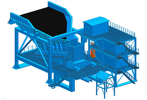 双齿辊半移动破碎站用于千万吨级以上大型露天矿原煤及剥离物的初级破碎,其开采工艺一般为单斗挖掘机—运输汽车—半移动破碎站—胶带机。利用汽车运输的灵活性,缩短了汽车运距,又发挥了带式输送适用于长距离运输、生产率高、成本低、维护量小、安全可靠的特点,同时可随开采推进定期迁移,机动灵活。