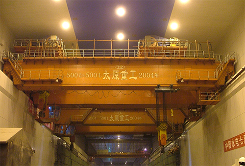 桥式起重机是横架于车间、仓库和料场上空,进行物料吊运的起重设备,使用范围广、应用数量多。太重生产的桥式起重机,标志性产品有:水电站1300吨桥式起重机、水电站500t+500t双小车桥式起重机等。