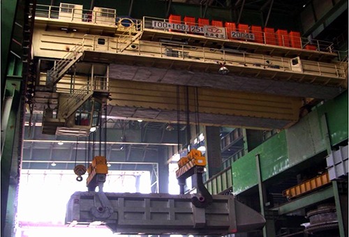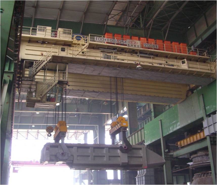 转炉炼钢过程中配置料箱起重机,主要用于添加冷料作业。电炉加料起重机主要用于向电炉加废钢,与铸造起重机主要区别在于主起升机构可以不考虑单机工作的工况