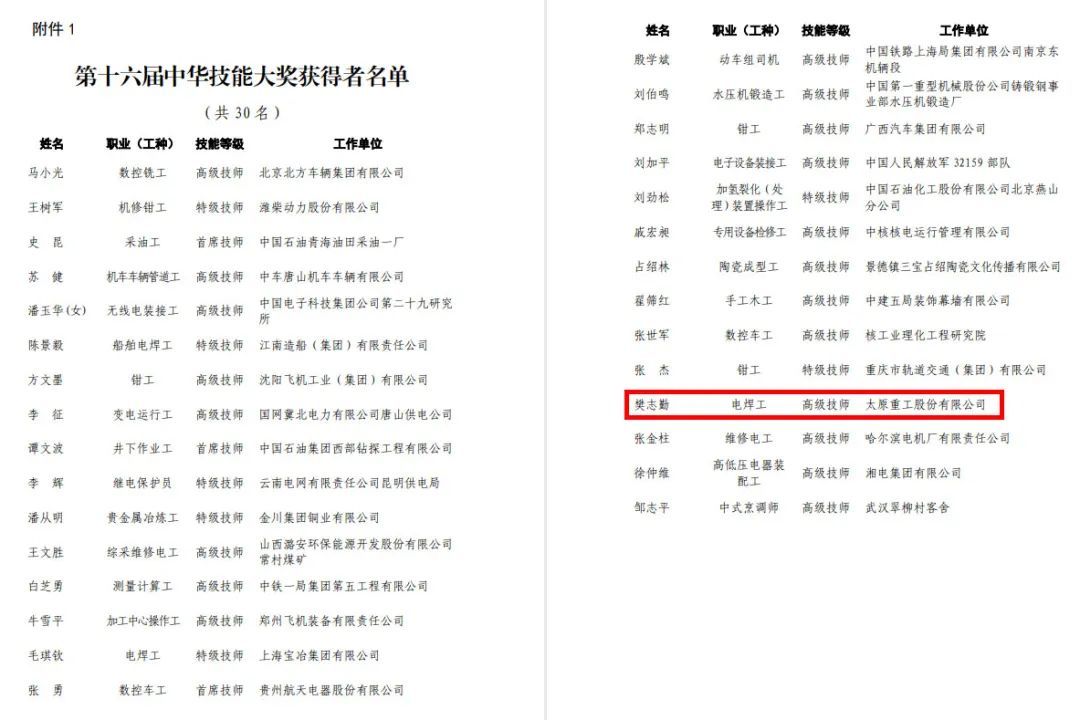 高级技师樊志勤榜上有名,也是获此殊荣的第一位太重人!衷心祝贺喜获殊荣!