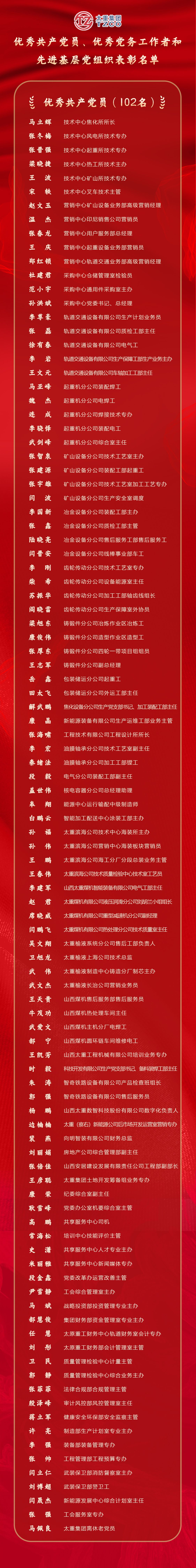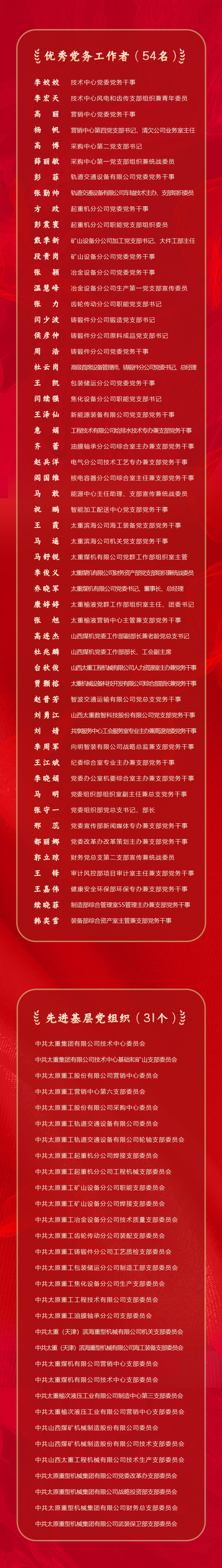 授予宋轶、郑红锁等102名同志“优秀共产党员”称号,授予张勤帅、高博、李宏天等54名同志“优秀党务工作者”称号,授予中共太原重工油膜轴承分公司支部委员会、中共每日大赛