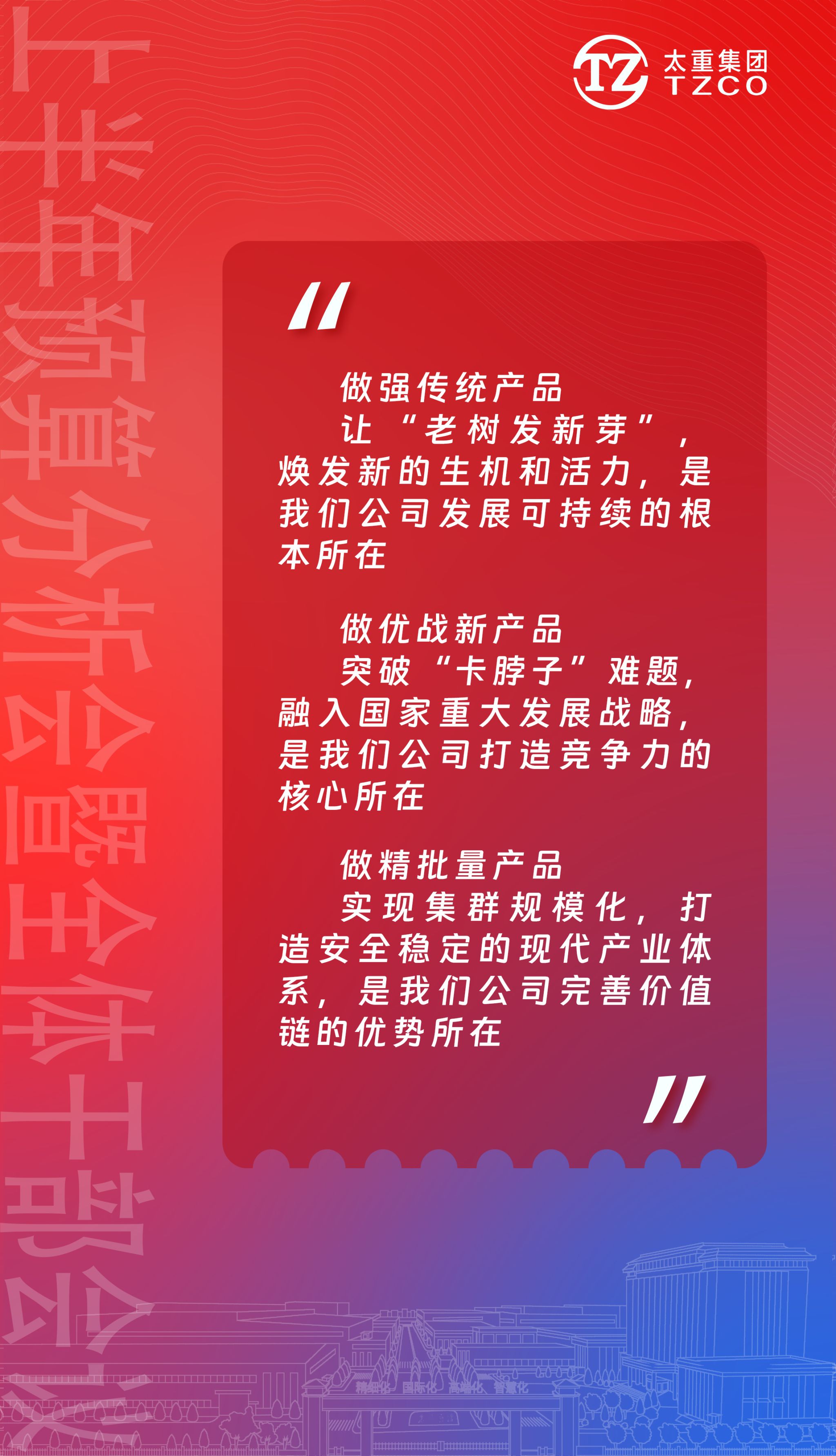 期待不容辜负,使命不容懈怠!让我们上下同欲、团结拼搏,铆足干劲加油干,积势蓄能攀新高,共同将太重建设成为跨越时空、基业长青、朝气蓬勃的百年老店!