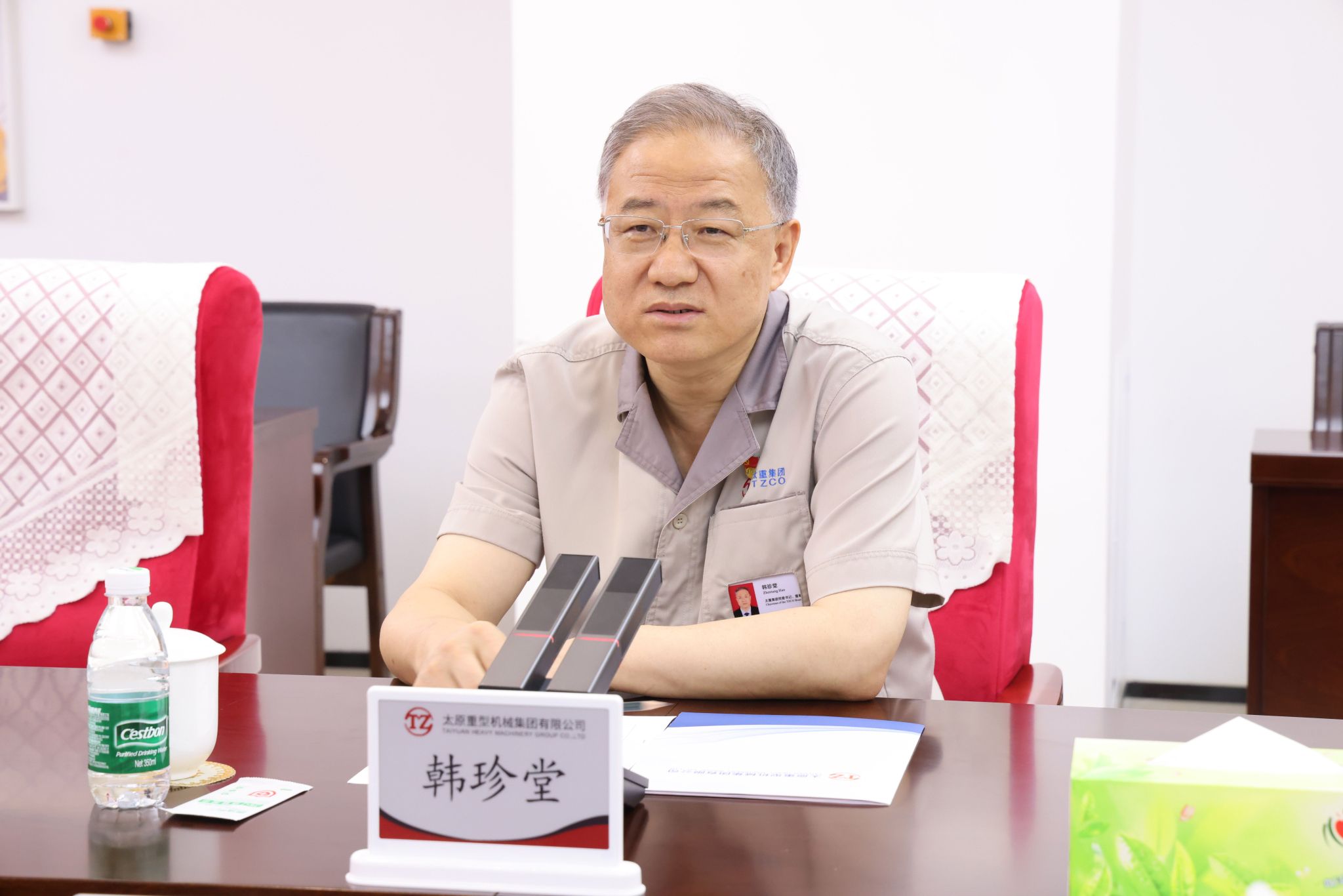 韩珍堂对客人一行的到来表示热烈欢迎,对山西农商联合银行长期以来的大力支持和帮助表示衷心感谢,并简要介绍了公司的发展历程、产品种类、产业布局、科技创新等方面的情况。他说,太重是新中国自行设计建造的第一座重型机器厂,累计创造了500多项中国和世界第一,为国家装备制造业作出了突出贡献。深化改革以来,太重在省委、省政府的大力支持下进行了气势如虹的改革、创新和发展,围绕落实新型工业化要求,以“高端化、智能化、绿色化、国产化”为产品定位,打造了“3+5+3”特色产品体系,公司制造能力、研发实力、产品实力都取得了长足进步,形成了“三个全球唯一”。作为全省转型升级的重点项目,太重智能高端装备产业园区历时19个月建成投产,获评“国家级智能制造示范工厂”,同时建设了世界上单一工厂规模最大、工序最全的挖掘机智慧工厂,形成了“一总部、多园区”产业布局。公司以科技创新为引领,加大研发投入力度,依托全国重点实验室和国家级企业技术中心,通过产学研用深度融合,实现创新能力的持续提升。作为地方金融主力军,山西农商联合银行与太重有着深厚的合作基础和广阔的合作前景,希望加强交流沟通,搭建银企合作新桥梁,为推动山西经济高质量发展贡献更大力量。