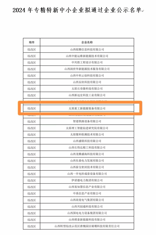 新能源公司是山西省唯一一家集风资源开发、设备制造、风场运营为一体的综合性大型风电产业服务商,具备全系列海上和陆上风机设计和制造能力,可为用户提供从设计、生产、营销到售后服务“一揽子”解决方案。产品涵盖3.6MW至12.0MW全系列平台化风电机组,并建成了全国最大的风机全功率试验平台。目前,已拥有发明专利近20项,并凭借突出优势成为全省风电装备产业链“链主”企业,获评国家级绿色工厂、创新型中小企业等荣誉称号。“专精特新”中小企业具备韧性好、效益高、潜力大、研发强等特点,推进“专精特新”中小企业发展,是持续增强实体经济发展活力、培育新动能的内在要求。当前,太重积极融入国家战略,以科技创新推动产业创新,培育了多个国家级、省级“专精特新”企业。未来,太重将坚持聚焦主业、苦练内功,持续提升专业性,增强创新能动性,提高核心竞争力,向产业链创新链价值链高端攀升,为建设制造强国贡献太重力量。