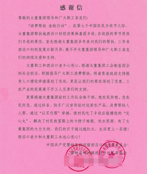 纸笺传心意,温情暖寒冬。近日,公司收到一份暖心的“礼物”,一封来自繁峙县砂河镇西沿口村支部委员会的感谢信。信中对公司积极开展消费帮扶,用心用情用力解决定点帮扶村农特产品销售难题,促进农民群众增收表示感谢。