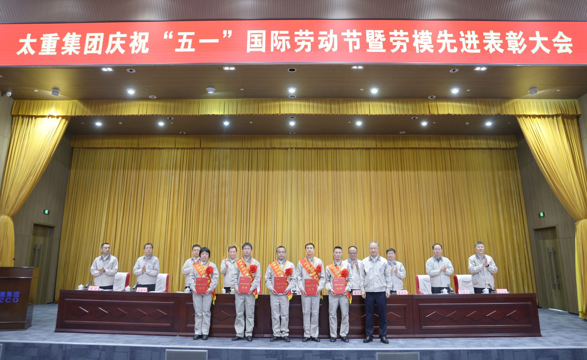 公司领导为受表彰的先进集体、劳动模范等代表颁发荣誉证书和奖牌
