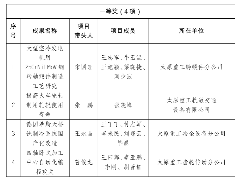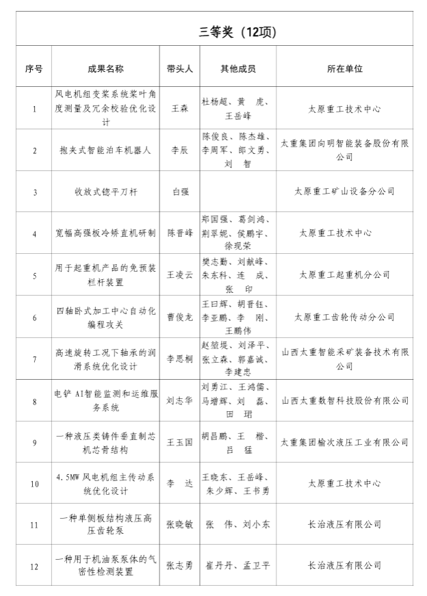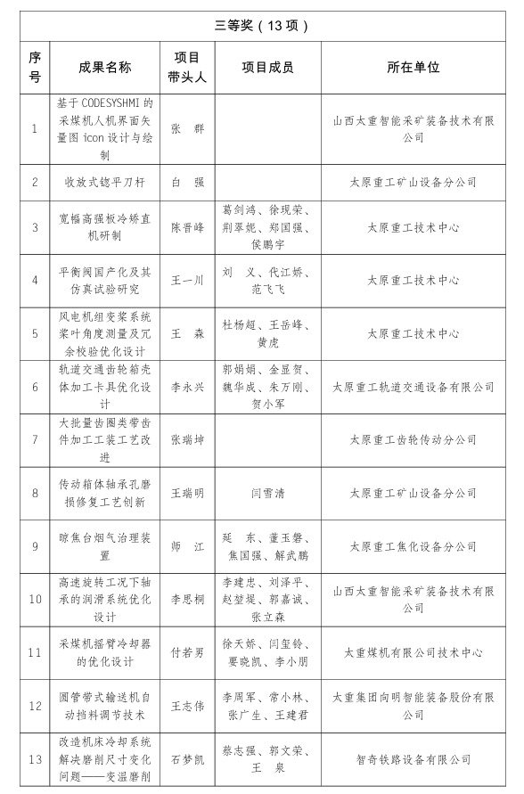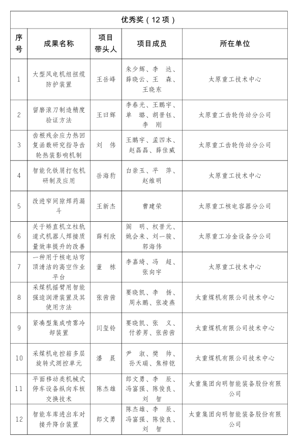 工会、太重煤机有限公司工会获2025年全市“五小”创新大赛优秀组织单位,太原重工起重机分公司、太原重工技术中心获2025年全市“五小”创新大赛优胜单位。