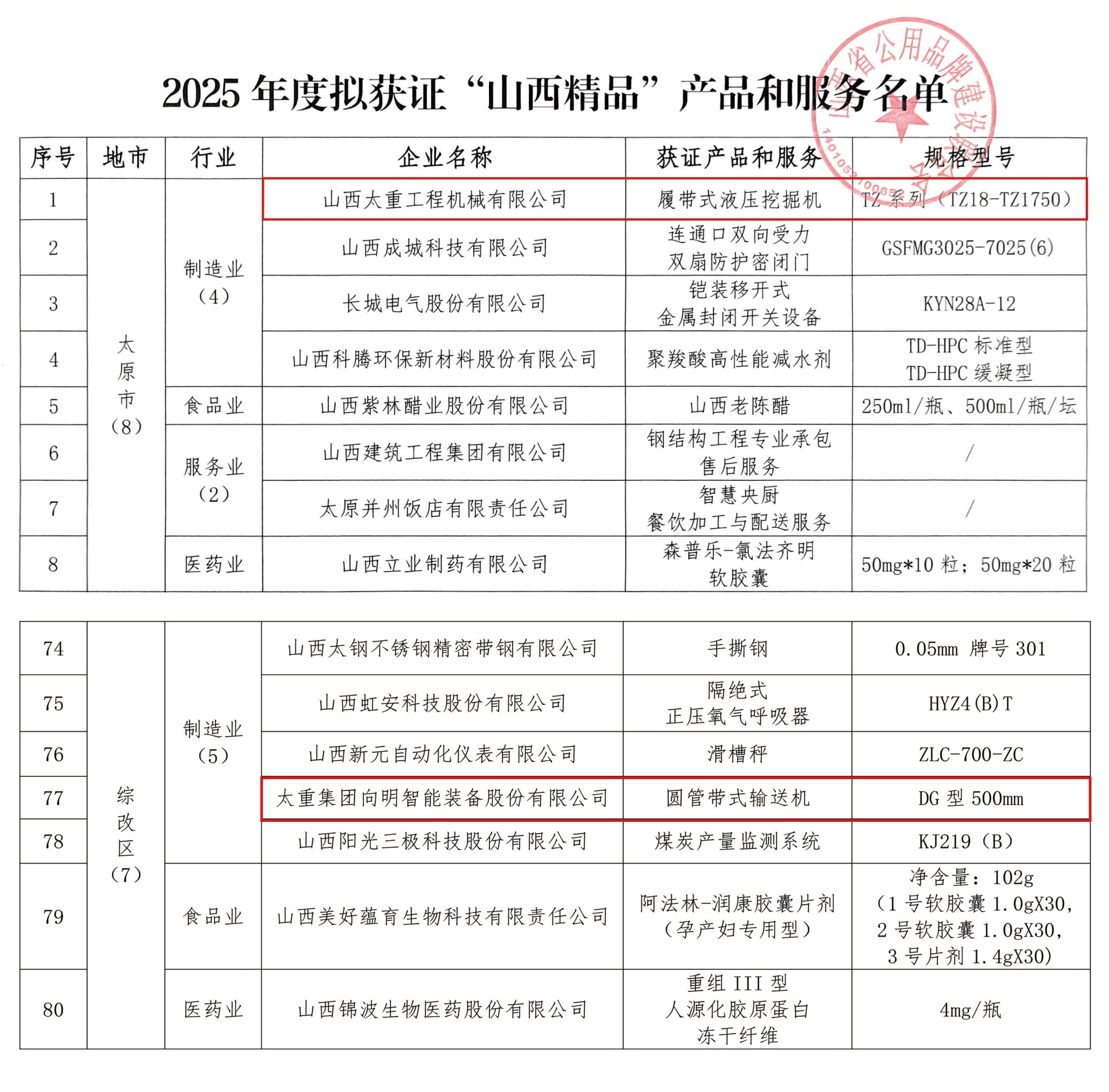 做强“山西精品”,擦亮“山西品牌”。近日,山西省公用品牌建设联合会公布了2025年度拟获证“山西精品”产品和服务名单。太重两款产品——履带式液压挖掘机和圆管带式输送机凭借过硬实力成功入选。这是继铸造起重机、城轨车轮后,太重产品再度获得该项荣誉。