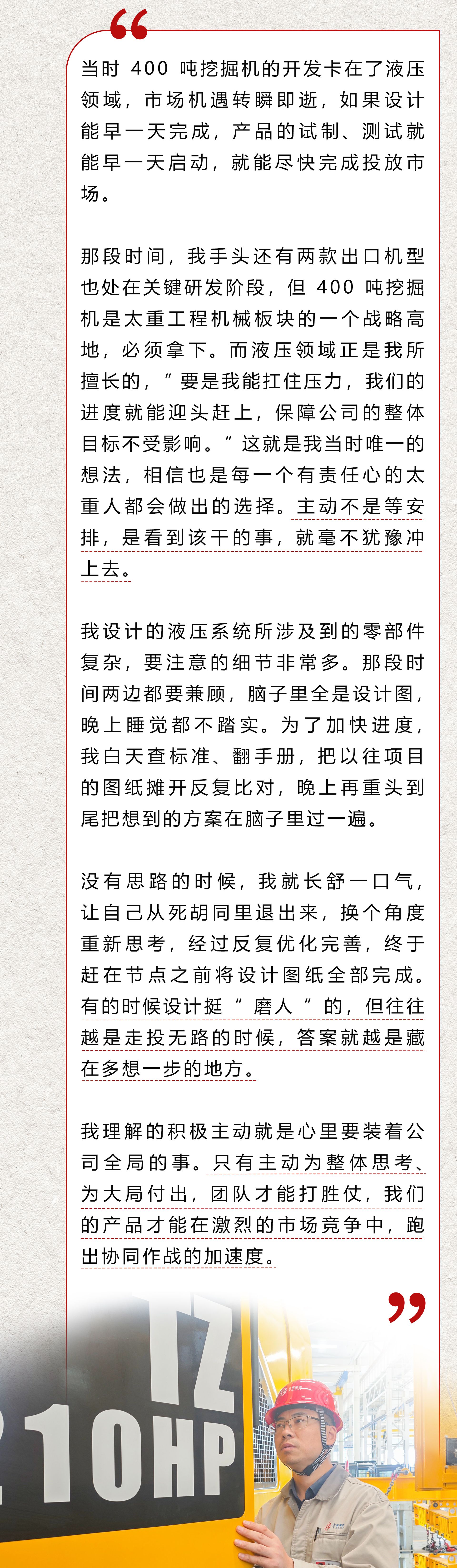 目前,秦斌主持和参与设计的挖掘机产品已有数十种,每一种他都能娓娓道来。众多成果中,最让秦斌记忆犹新的,是他主动承担压力、为公司重要战略抢出时间的特殊经历。