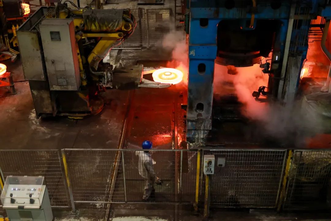 然后对切割好的钢锭进行加热。加热好之后,便可以进行锻造轧制了,通俗地说,就是“塑型”。