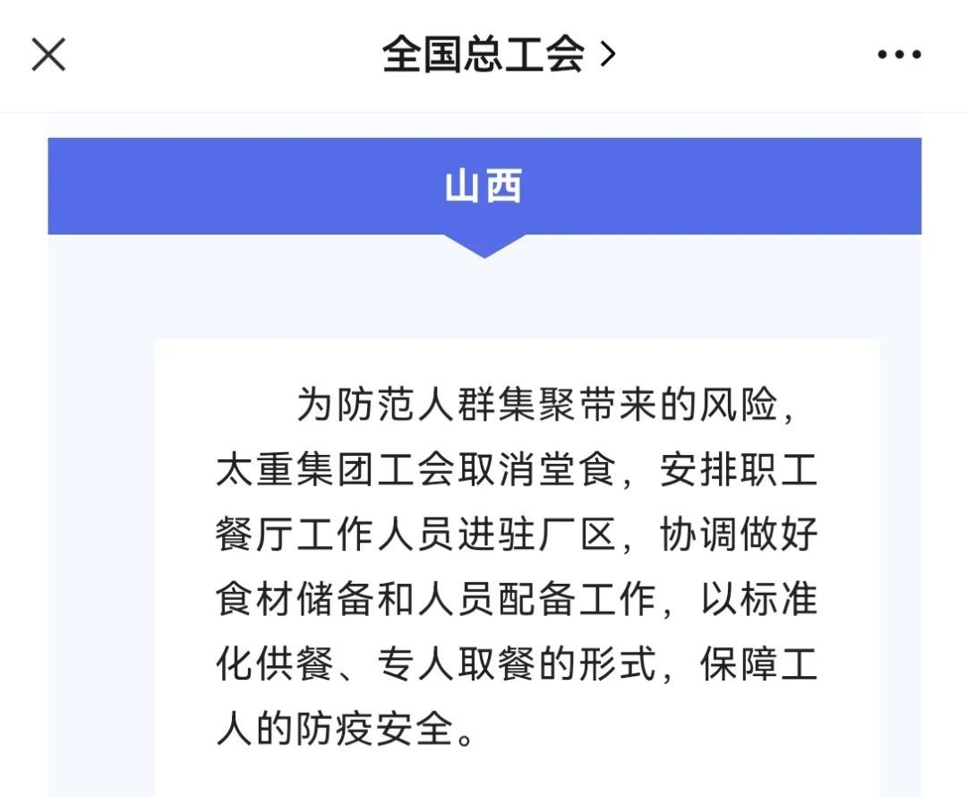 工会取消堂食,安排职工餐厅工作人员进驻厂区,协调做好食材储备和人员配备工作,以标准化供餐、专人取餐的形式,保障工人的防疫安全。