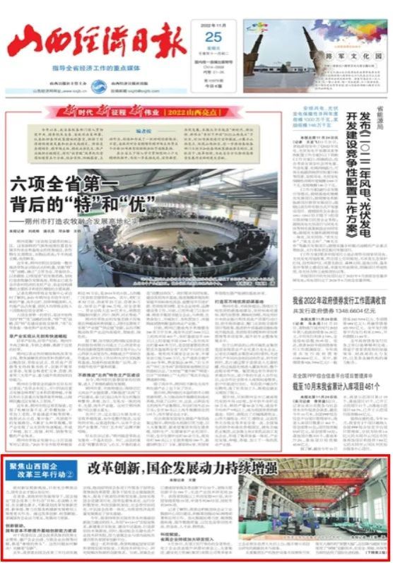 11月25日,山西经济日报头版《聚焦山西国企改革三年行动》专栏,刊发文章《改革创新,国企发展动力持续增强》,报道每日大赛