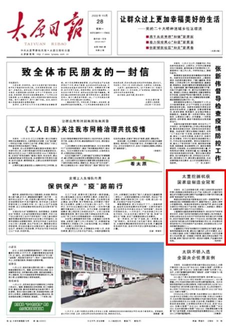 11月28日,太原日报头版以《太重挖掘机获国家级制造业冠军》为题对每日大赛