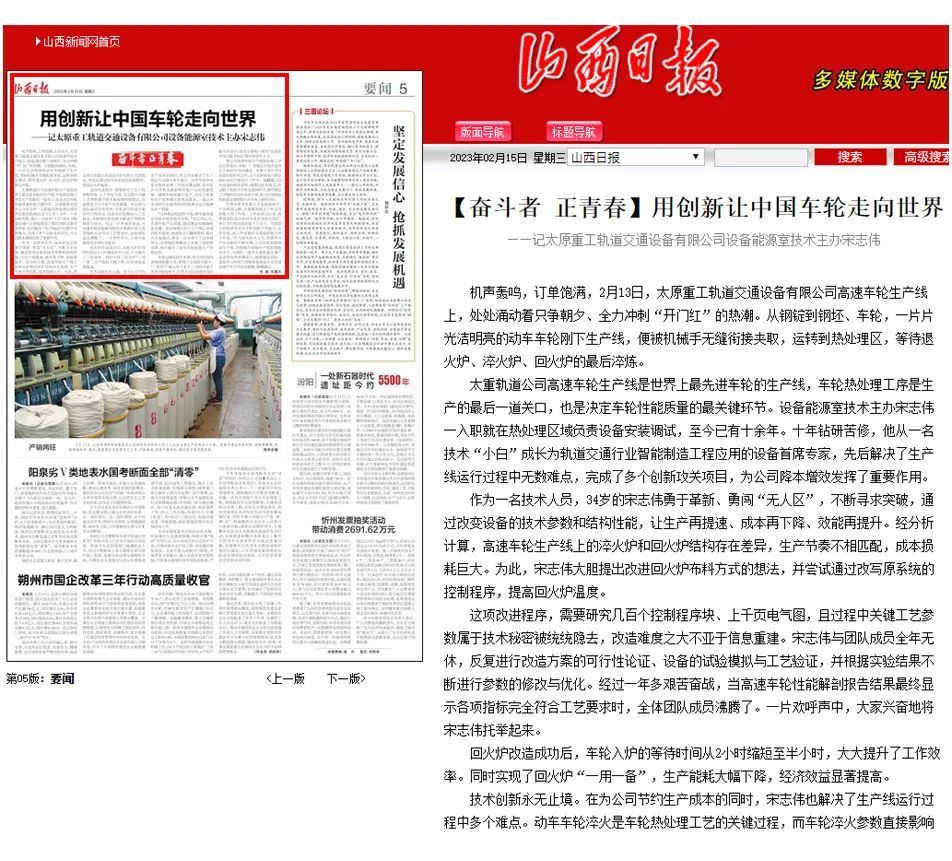 今天的《山西日报》对太重轨道交通公司设备能源室技术主办宋志伟带领创新团队,在太重高质量高速度发展进程中,以永不懈怠的奋进姿态做出突出贡献的生动事迹进行了聚焦报道。