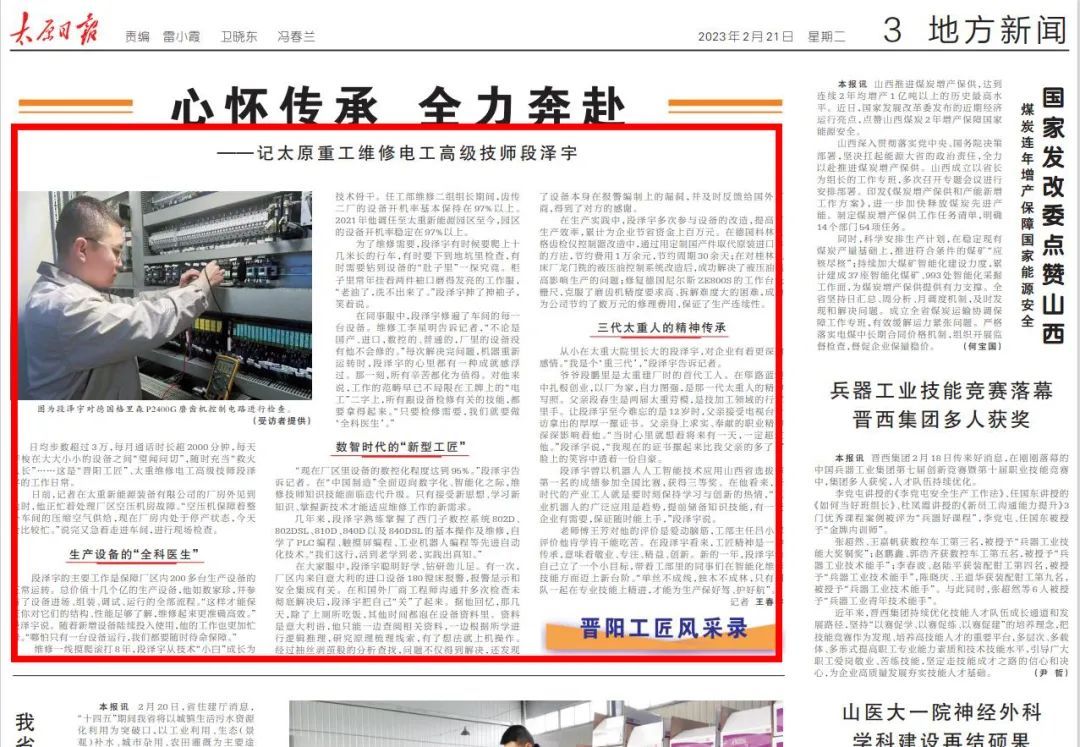 齿轮传动分公司电工段泽宇荣获了太原市第四届“晋阳工匠”荣誉称号。《太原日报》于日前对其事迹进行了宣传报道。