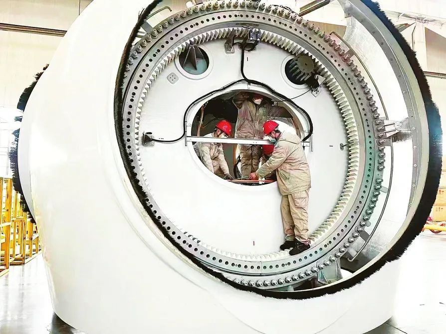 新能源公司风电整机装配车间内,装配工正在进行轮毂内装作业