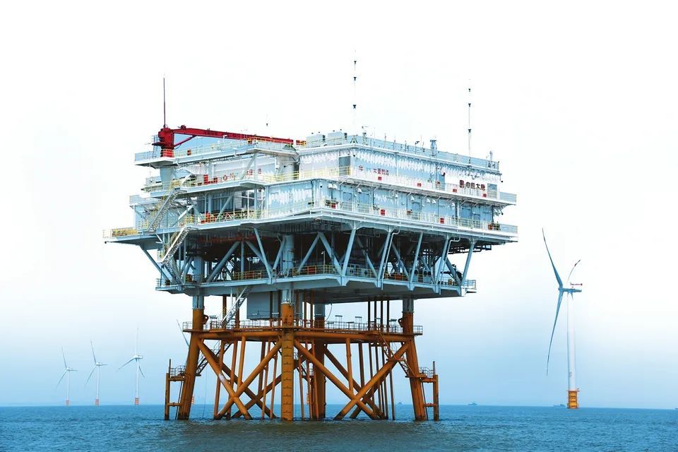 由太重制造的全国首个海上220kV全预制舱组块海上风电升压站