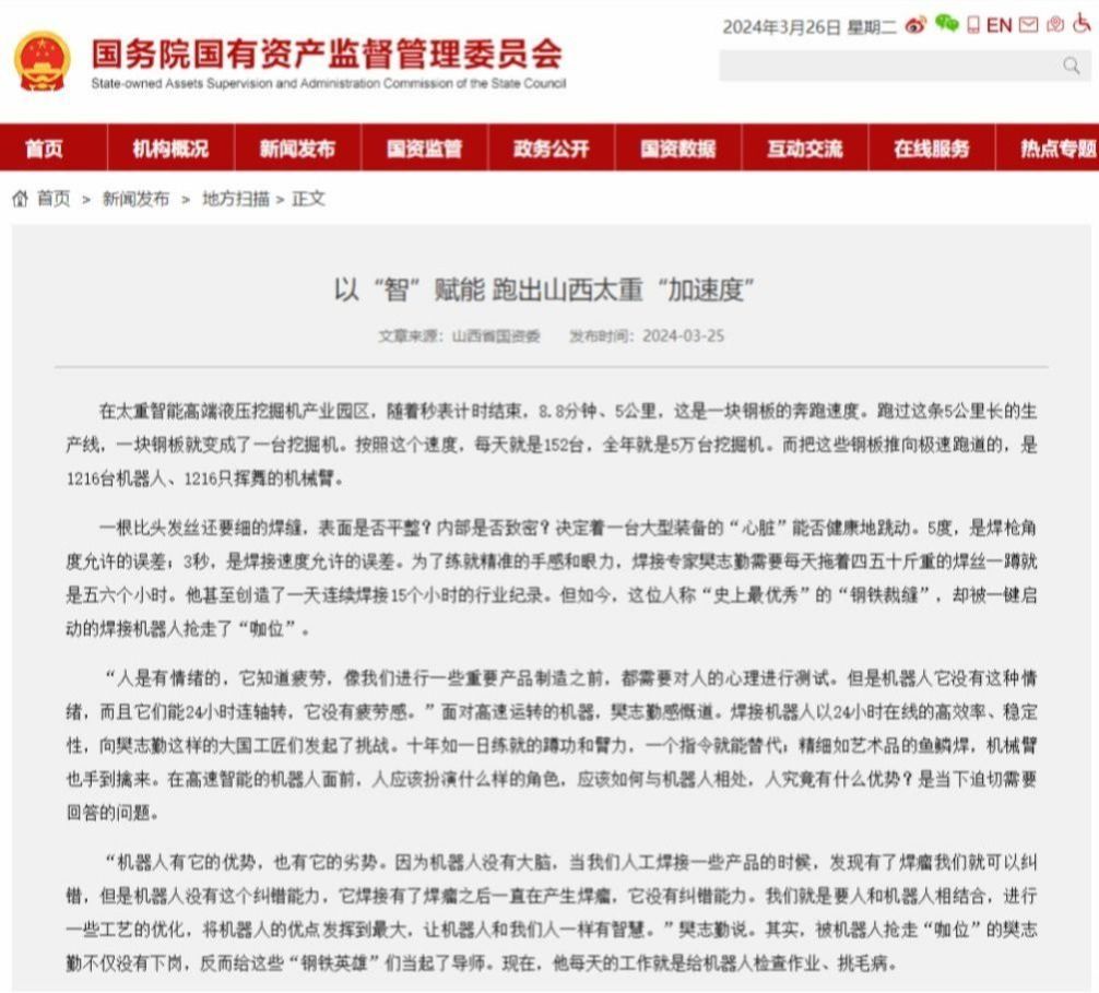 在太重智能高端液压挖掘机产业园区,随着秒表计时结束,8.8分钟、5公里,这是一块钢板的奔跑速度。跑过这条5公里长的生产线,一块钢板就变成了一台挖掘机。按照这个速度,每天就是152台,全年就是5万台挖掘机。而把这些钢板推向极速跑道的,是1216台机器人、1216只挥舞的机械臂。