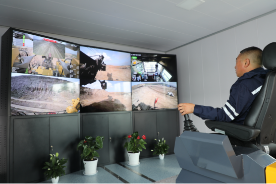 公司为霍林河南露天煤矿提供的WK-12C电铲,配备了远程操控智慧化解决方案。通过对现场画面、声音、振动等环境感知和模拟,用户可以在距离现场10km之外的远程操作室,对电铲进行操作控制,全链路延时控制在250ms以内。